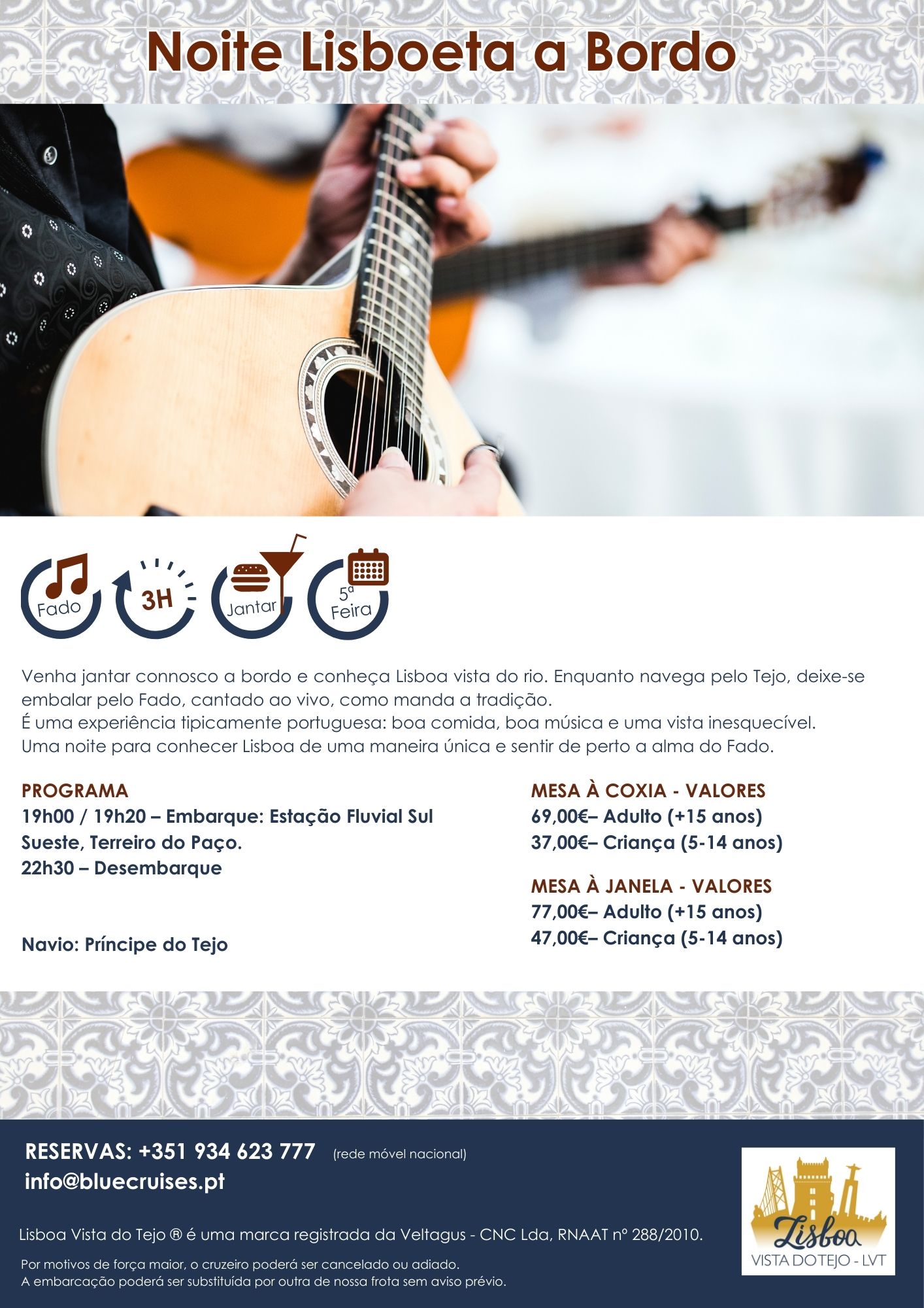 Venha jantar connosco a bordo e conheça Lisboa vista do Tejo. Enquanto navega, deixe-se embalar pelo Fado, cantado ao vivo, como manda a tradição.